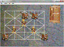 It is also known as Tiger and Goat game. Tiger wins by eating atleast 9 Goats by jumping and Goats win by trapping all four Tigers. Tigers may move along the lines from one intersection to another.